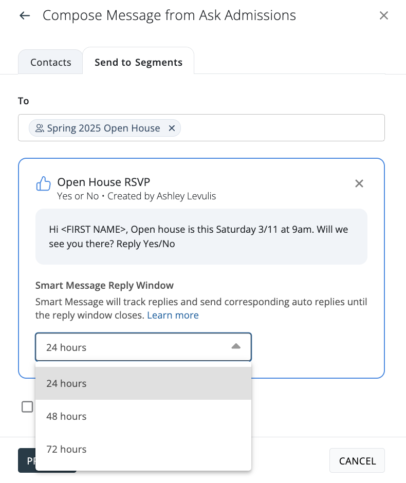 4. After selecting a smart message, select your desired smart message reply window. The reply window is the amount of time a smart message will track replies and send the auto replies. You can select between 24, 48 and 72 hours. Once that window closes, replies to that smart message will not be tracked.