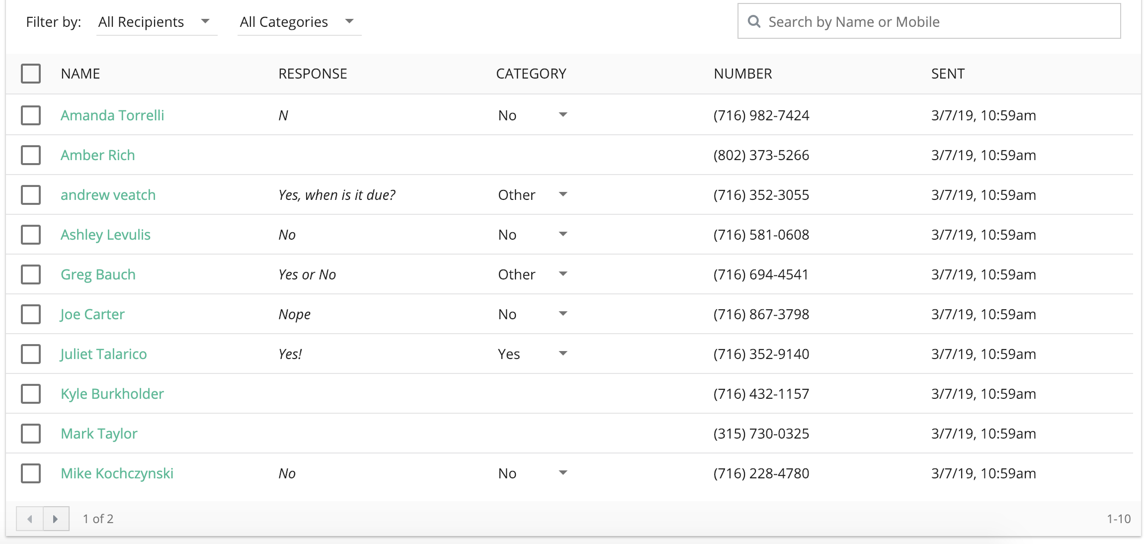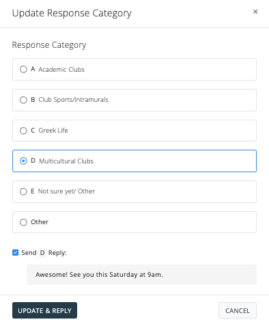 In the "Recipients" area, you'll see a list of all recipients, their response as well as the category. Anything that constitutes a valid response based on the type of smart message will automatically be categorized as such.