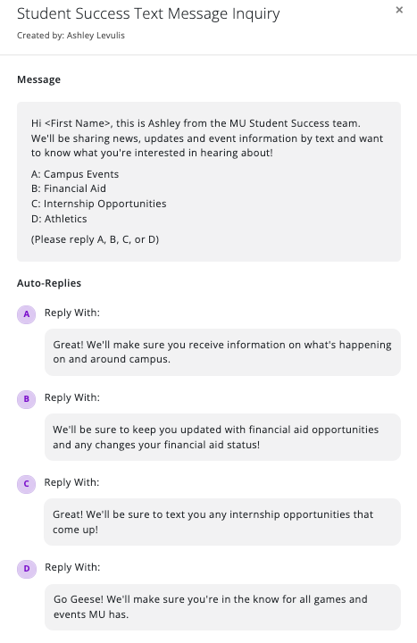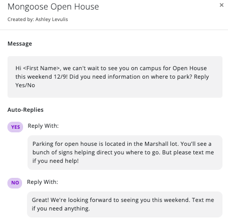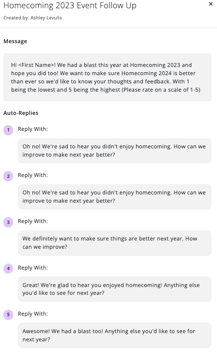 After your message goes out, recipients that respond with a valid response will automatically receive the corresponding automated message.