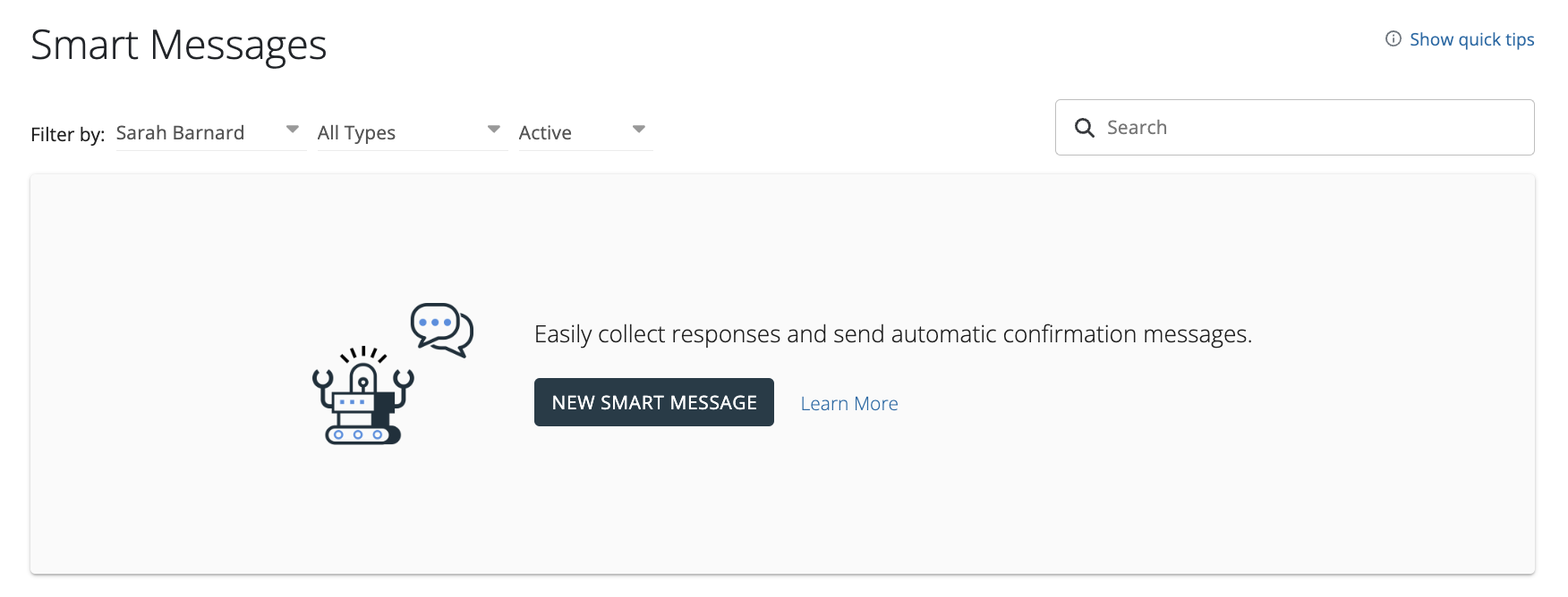 Smart messages allow you to send text messages that prompt recipients for a specific reply (yes/no, multiple choice or 1-5), and based on the response, automatically send a pre-configured follow up message.