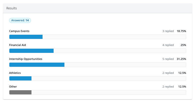 The "Results" area is a reactive chart displaying information based on the answers received. This chart will update as new replies come in and/or if any answers are updated in the "category" area.