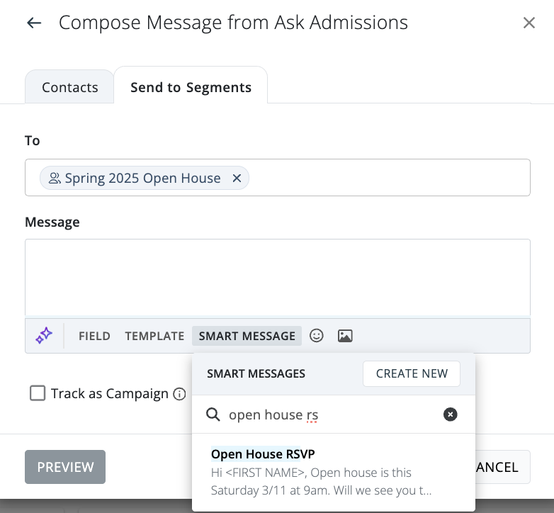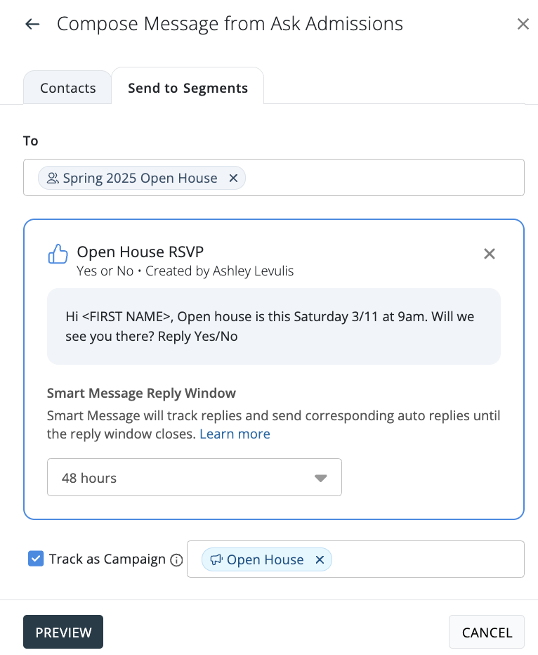 Once you've selected a reply window, you can determine whether or not you would like to track the message as a campaign, then click [ Preview]