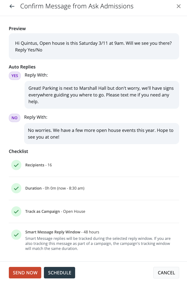 Note: The recipient must respond to the smart message within the selected reply window time (24, 48 or 72 hours) for the automatic responses to be sent.