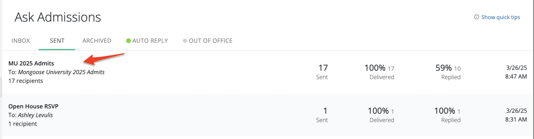After you send a message, navigate to inbox's Messages area (click the name of the Personal or Shared Inbox from the navigation on the left-hand side). Click Sent to display a list of messages you have sent, then click on the actual message to view details.
