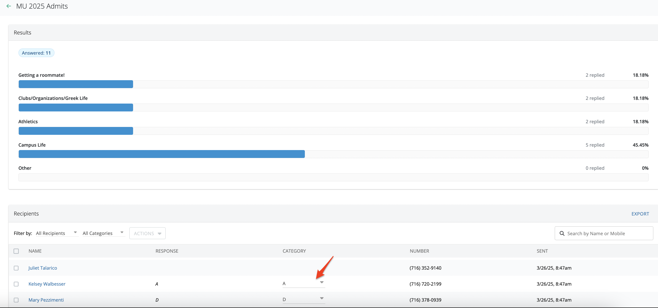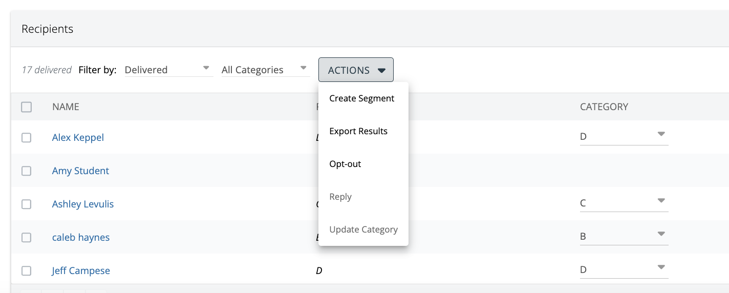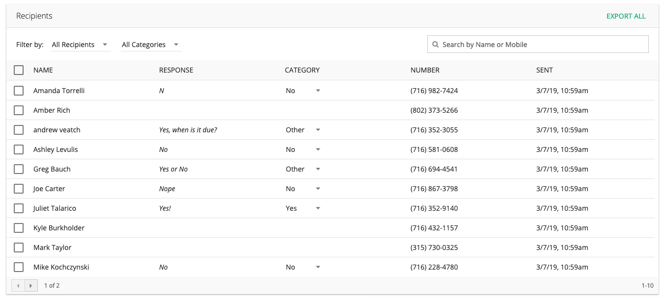 In the "Recipients" area, you'll see a list of all recipients, their response as well as the category. Anything that constitutes a valid response based on the type of smart message will automatically be categorized as such.