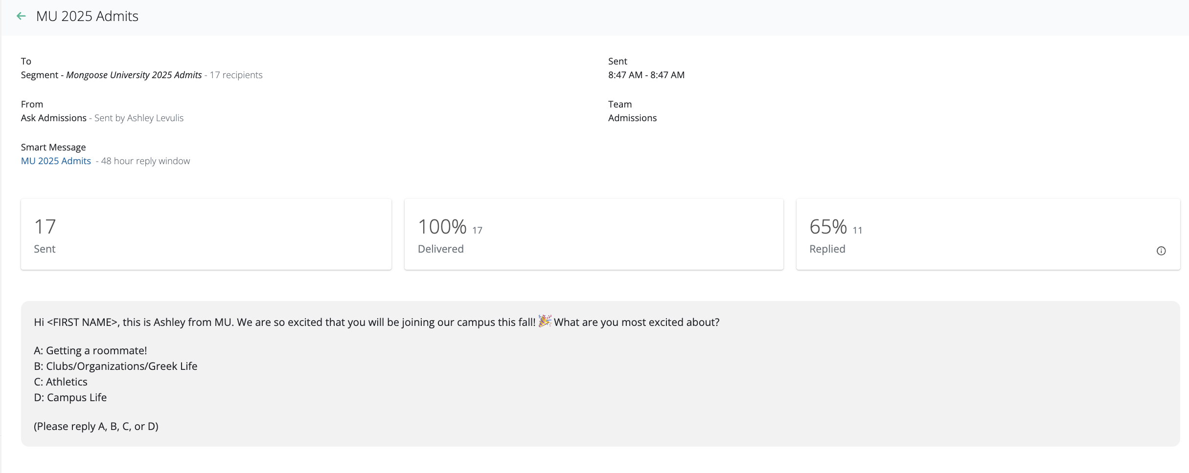 - Smart Message: Name of the smart message template that was used along with the selected reply window (24, 48 or 72 hours).