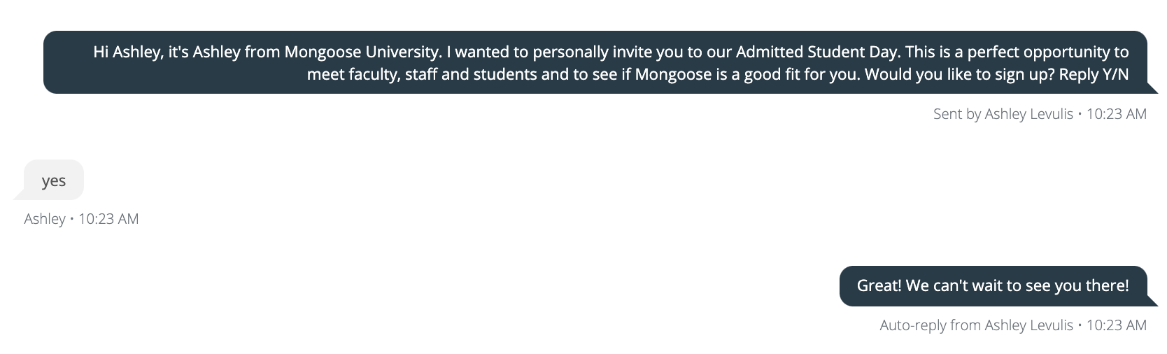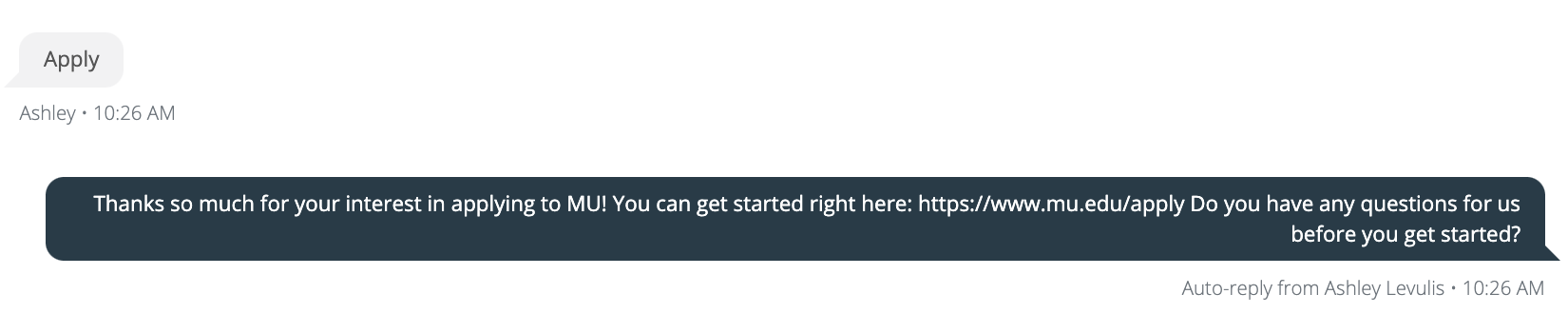 Auto Reply does not require an initial outgoing message and utilizes the matching of customizable keywords. There is no reply time window like smart messages. A contact can text into Mongoose a keyword and receive a pre-configured auto reply follow up message.