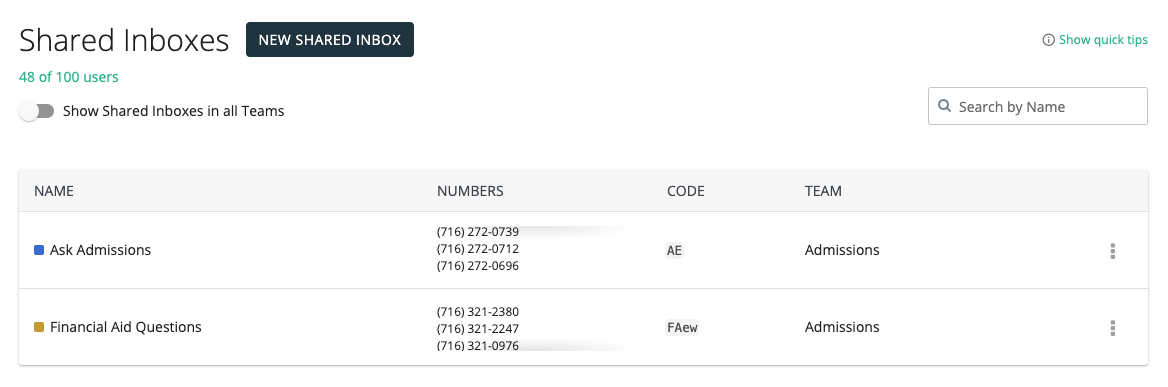 To find your Shared Inbox phone numbers, navigate to “Team Name” > Shared Inboxes. The six phone numbers your shared inbox utilizes are displayed here.