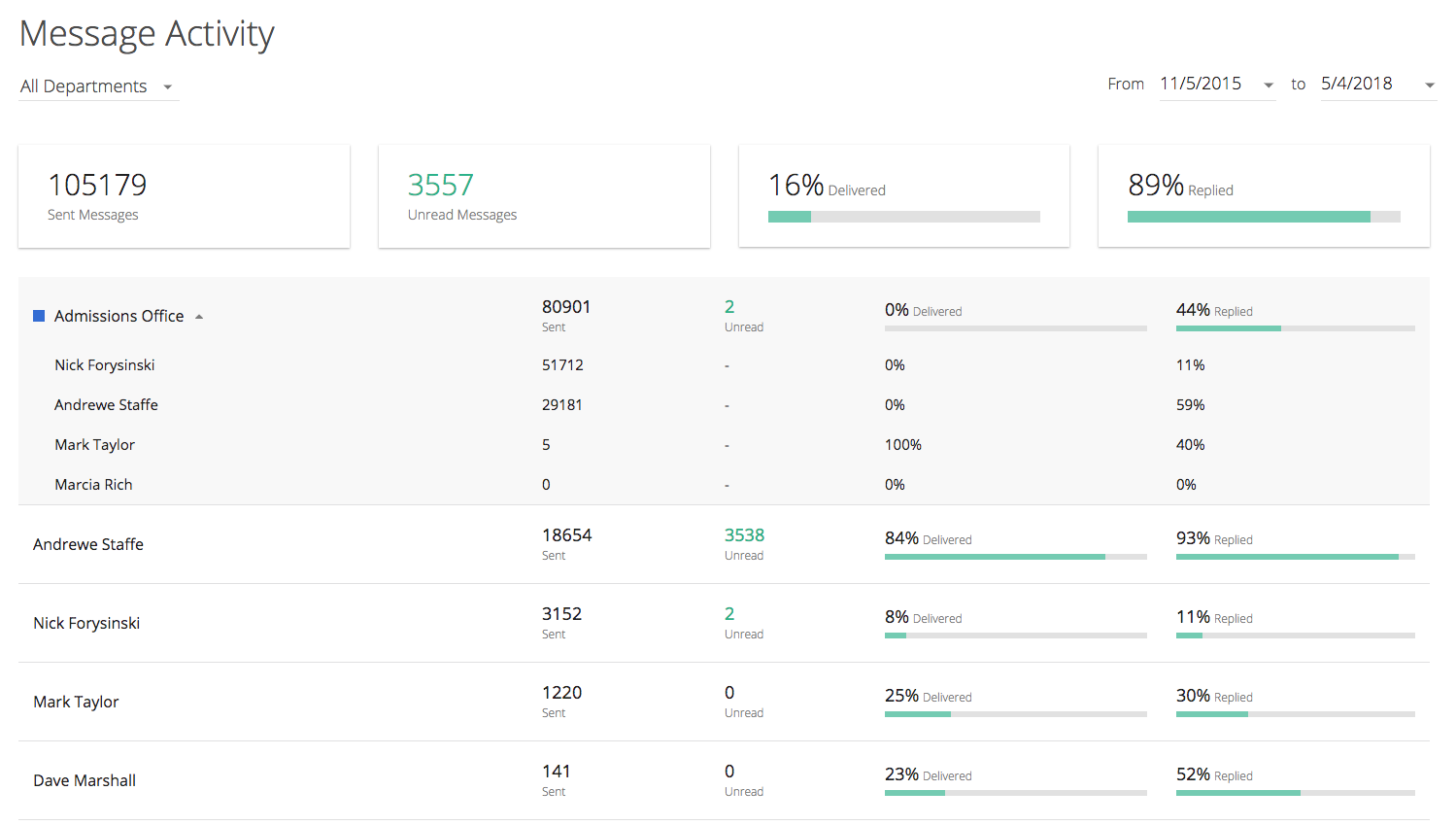 - Unread Messages - These are messages that have not been read by users. A message is considered as "read" when it is clicked on within the user's inbox, opening the conversation with that contact. If a user marks a message as "Unread" after reading it, the message will still considered "read" from a reporting perspective. This will help administrators evaluate if there are messages from contacts that have not been read/opened at all.