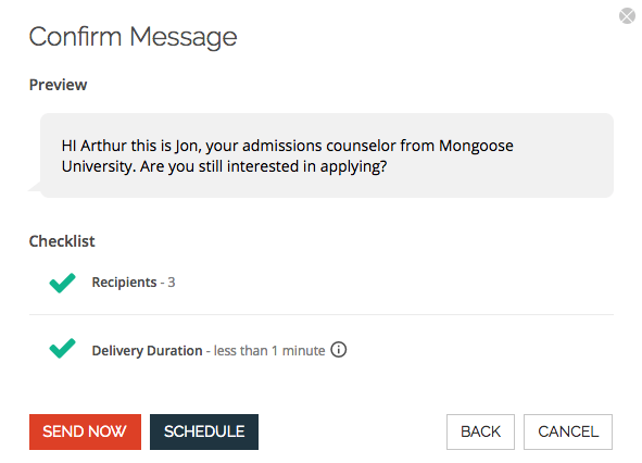 - If you are sending to more than one recipient, each recipient is sent a text in 12 second increments. This "throttling" is in place to help prevent carrier violations. A delivery duration is displayed before you send the message which shows the entire time it will take for all messages to be sent.