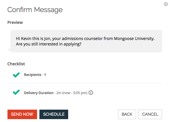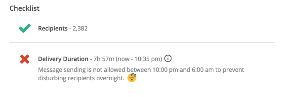 - If you are a team Admin and utilizing the Send as assigned user feature, the start/end time and message queuing takes into account what the users have queued as well. This may increase the end time shown in the "preview" screen during the compose process.