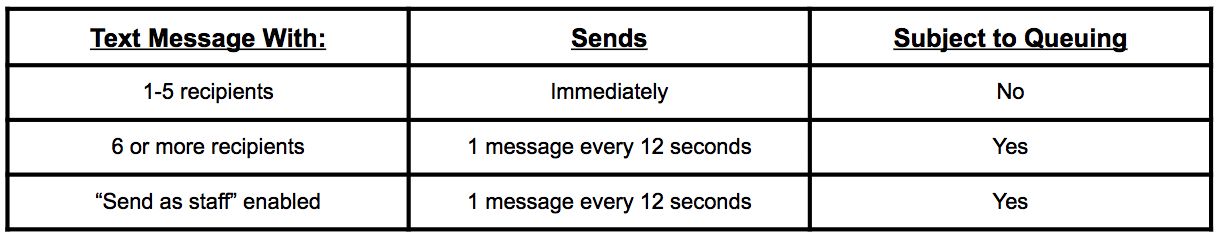 - If you send out another text message between the start/end times of the previous message, the new message will be queued behind the previous message until it finishes sending. For example, if you just sent a message to a Segment of 700 recipients and it is still sending out, any other messages sent to 6 or more recipients during that time will be queued behind it. Subsequent messages are essentially "stacked" behind the one currently sending.