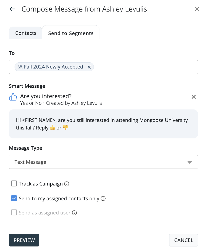 When composing a message, there is a feature called Send to my assigned contacts only. This allows any user to send a message to only contacts who are assigned to them from any shared segment or contact list. If the "StaffId"/"UserID" field isn't imported for your school, uncheck this option in order to send a text to contacts.To learn more about Send to my assigned contacts only, click here.