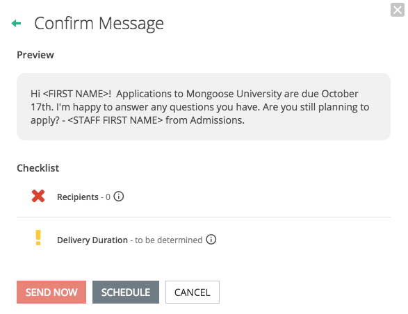 If you are seeing "0 Recipients" on the confirm page, you have selected contacts and/or a segment that has contacts that are not currently assigned to you or your school does not use the "StaffId/UserId" field.